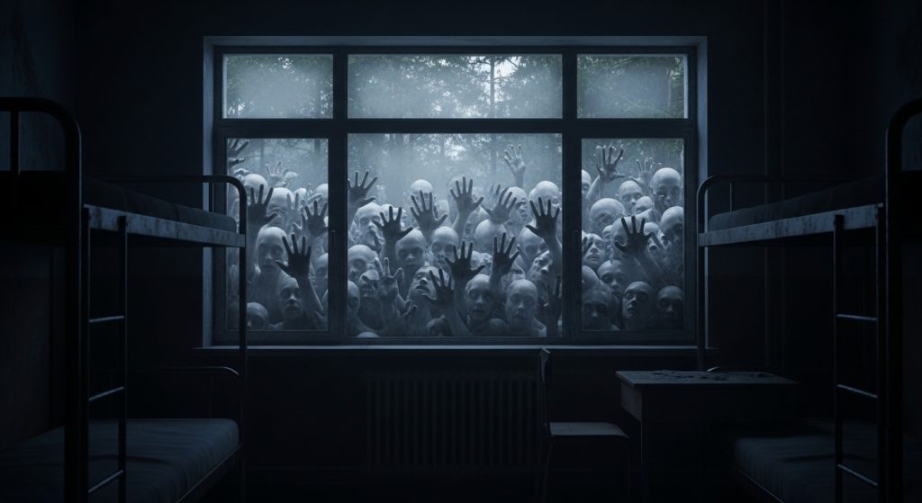 カーテンを開けて外を確認しようとした生徒もいましたが、あまりの音の激しさに誰一人として窓に近づくことはできなかったそうです。実際のところ、高標高の山の上では突風が建物の隙間に入り込み、複雑な反響音を作ることがあります。しかし、その時現場にいた子供たちにとっては、それは間違いなく「外から誰かが入れてくれと懇願している音」にしか聞こえなかったのです。翌朝、窓ガラスを確認すると、子供の手の跡のような曇りが一面についていたという後日談までセットで語られることが多いエピソード。